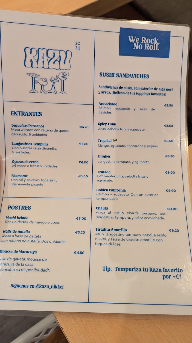 Welcome to Kazu - Centro, where innovation meets tradition in Madrid's vibrant heart at C. de Pelayo, 49. This unique establishment specializes in sushi sandwiches, offering a delightful twist on classic Japanese flavors. The menu features enticing combos, such as the Combo 4 Sushi Sandwiches with two delicious appetizers for just €38.50, catering to sushi lovers seeking variety.